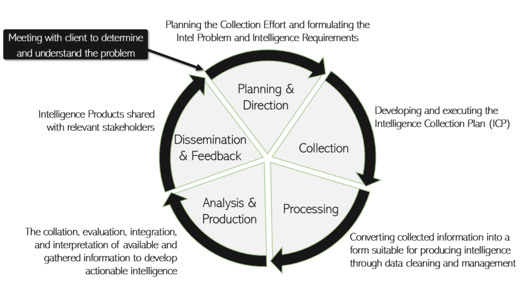 Our approach is informed by the Intelligence Cycle to efficiently gather and collate data in order to plan, collect, process, analyse, and disseminate information to provide foresight, achieve project goals, and develop solutions to mitigate risks.